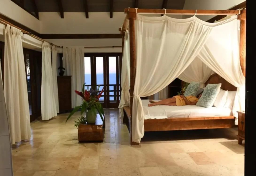 The villa’s spacious kitchen is equipped with modern appliances and plenty of workspaces, ensuring you can create delicious feasts inspired by local ingredients and popular dishes, such as Gallo pinto. A Moroccan-inspired lounge area opens onto the outdoor spaces, allowing cooling sea breezes to circulate and providing beautiful ocean views. The dedicated media room also allows for cosy movie nights, should the mood take you.