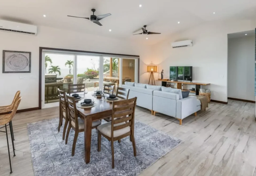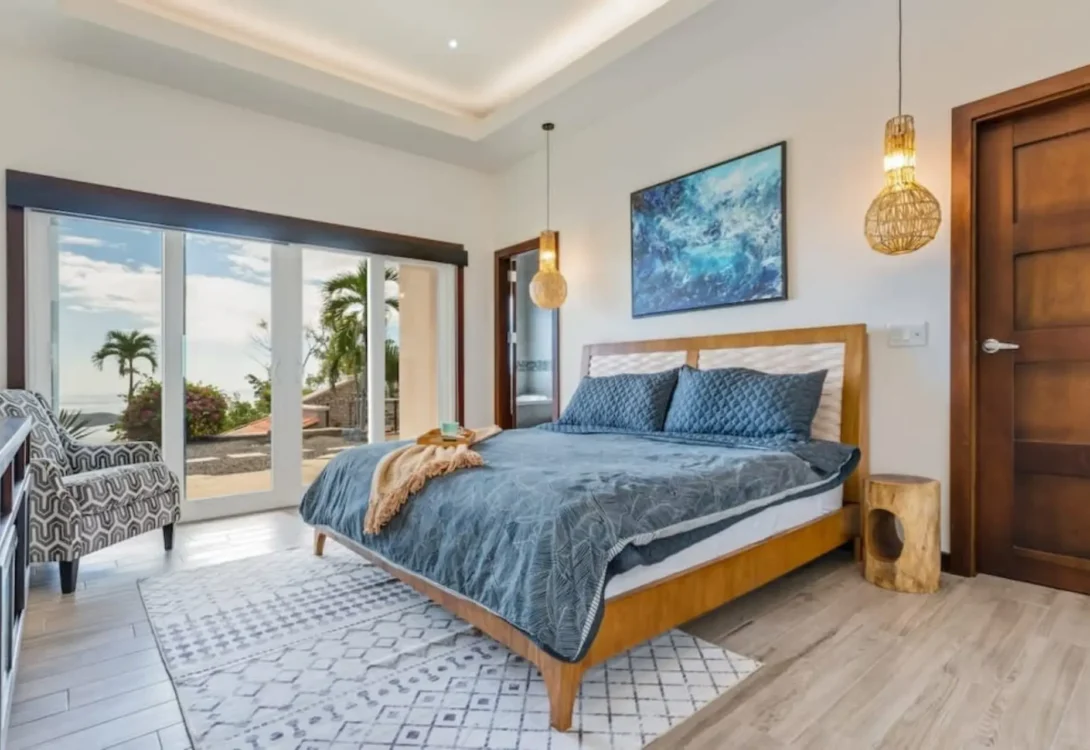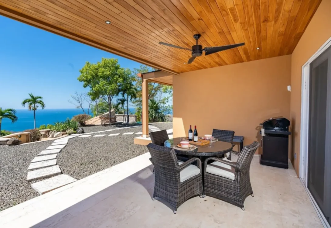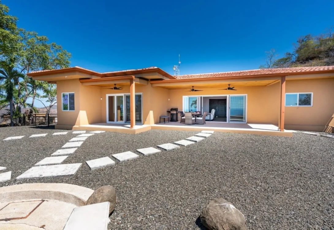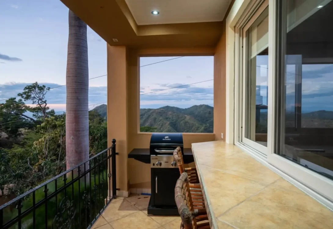 This mountaintop villa with Guesthouse in Potrero is a huge, gorgeous property, rightly named “Island in the Sky,” with a 3-bedroom main home, a 2-bedroom guesthouse, a beautiful pool and expansive views of the Pacific coastline below. The main home has 3 bedrooms, all with king or queen beds, each with its own big closet and bathroom. And there’s a fourth bathroom off the hall. The guesthouse/apartment, just downstairs from the main home and with its own ocean view, has 2 bedrooms and 1 bathroom. It just underwent a remodel from top to bottom, so everything there is brand-new. Even the bathrooms are elegant here – some with double sinks, separate shower and tub, and fine stone work. The living room contains all-new furniture, including a blue-gray modular sofa, wooden tables and a giant TV. The dining area features a long wooden table, and beyond that is a quartz kitchen island. The immaculate kitchen has quartz counters, white cabinets, stainless-steel refrigerator, stove, microwave and dishwasher. The home is air-conditioned but is also swept by mountain breezes that keep it cool, with lots of natural light and open space. Outside, the rear patio has new dining and lounging furniture, plus a barbecue. Past a landscaped area and down a stairwell is a large, newly renovated swimming pool with a coralline deck. This property has three gated entrances, a 3-car parking garage and an on-site caretaker.