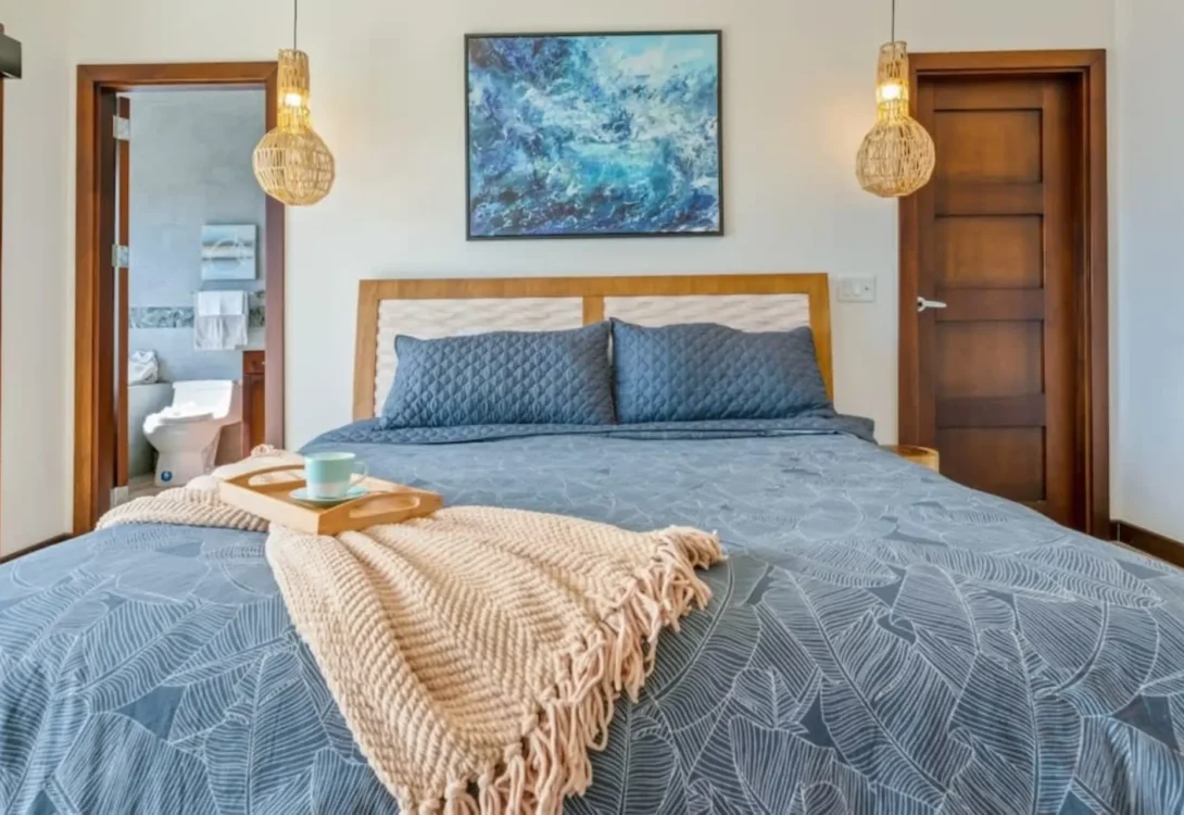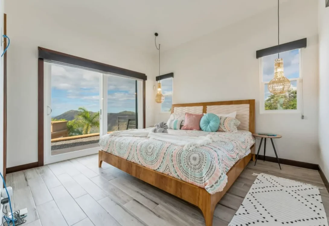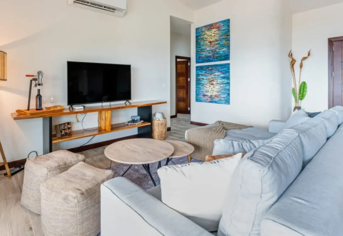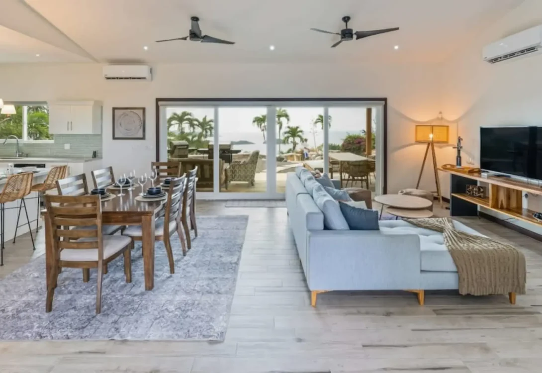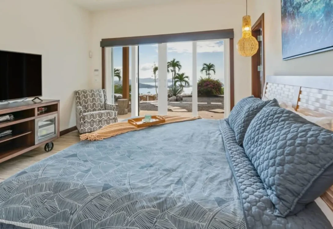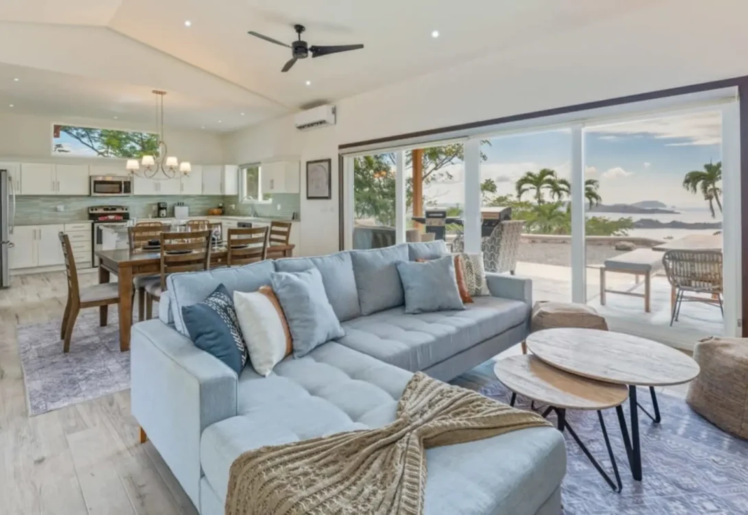 This mountaintop villa with Guesthouse in Potrero is a huge, gorgeous property, rightly named “Island in the Sky,” with a 3-bedroom main home, a 2-bedroom guesthouse, a beautiful pool and expansive views of the Pacific coastline below. The main home has 3 bedrooms, all with king or queen beds, each with its own big closet and bathroom. And there’s a fourth bathroom off the hall. The guesthouse/apartment, just downstairs from the main home and with its own ocean view, has 2 bedrooms and 1 bathroom. It just underwent a remodel from top to bottom, so everything there is brand-new. Even the bathrooms are elegant here – some with double sinks, separate shower and tub, and fine stone work. The living room contains all-new furniture, including a blue-gray modular sofa, wooden tables and a giant TV. The dining area features a long wooden table, and beyond that is a quartz kitchen island. The immaculate kitchen has quartz counters, white cabinets, stainless-steel refrigerator, stove, microwave and dishwasher. The home is air-conditioned but is also swept by mountain breezes that keep it cool, with lots of natural light and open space. Outside, the rear patio has new dining and lounging furniture, plus a barbecue. Past a landscaped area and down a stairwell is a large, newly renovated swimming pool with a coralline deck. This property has three gated entrances, a 3-car parking garage and an on-site caretaker.