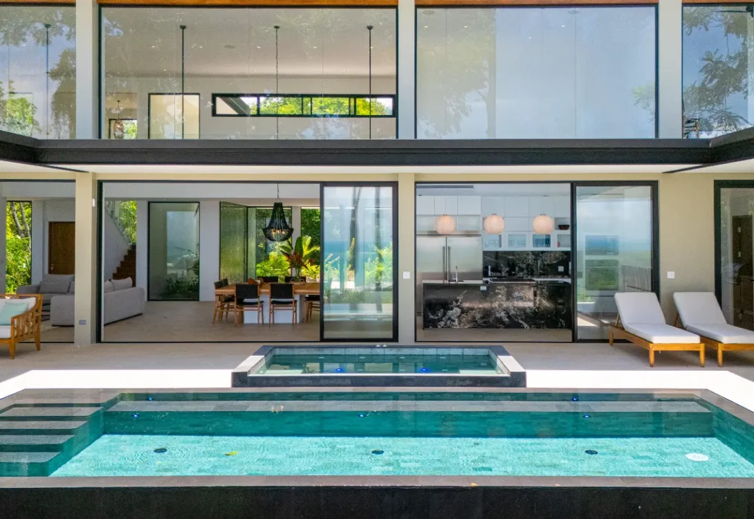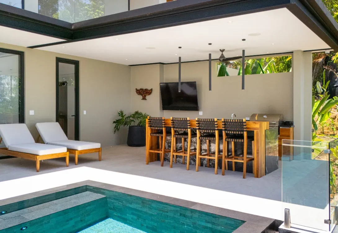 Air Conditioning - Bedrooms & Common Area, An outdoor fireplace with cozy cushions seating up to 8 guests, Dining Area, Bed and Bath Linens, Children Welcome, Dishwasher, Dryer, Gated Property, Evening Guard for the community, Hair Dryer, Outdoor Swimming Pool, Outdoor Jacuzzi, Interior Bedrooms, Fiber Optic Internet, Kettle, Microwave, 3 outdoor private parking spaces, Private Office with A/C, desk and chairs, Outdoor Grill, Outdoor sink, Oven/Range, Patio/Terrace, Pack n Plays – Available upon request, Pool towels, Refrigerator, TV - Flat-Screen Smart TV, View - Jungle, View - Ocean/Sea, Washer, High Speed WiFi, Blender, Soap & Shampoo, Coffee Maker, Espresso Machine, Multi-room audio system (Bluetooth)