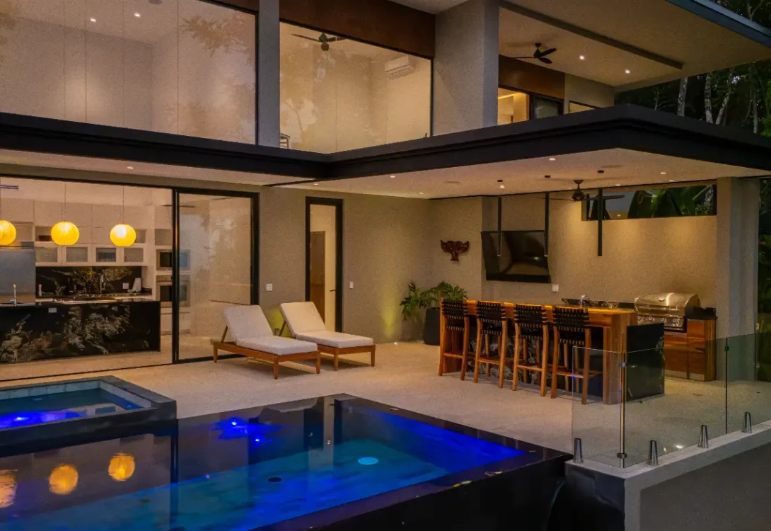 One of the villa’s standout features is its connection with the outdoors; an awe-inspiring firepit surrounded by a cozy seating area invites you to enjoy memorable evenings under the stars. Adjacent to the sparkling infinity pool, you'll find a luxurious jacuzzi, creating a flawless transition from exhilarating swims to soothing relaxation. Enhance your outdoor experience with selections from the outdoor wine fridge, ensuring your refreshments are always at the perfect temperature.